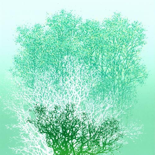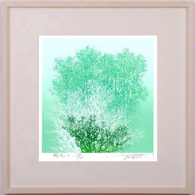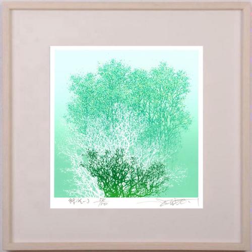 池上壮豊先生がシルクスクリーンの版画で制作した木の絵画「緑光-3」は、緑の色がとても美しい木の絵です。