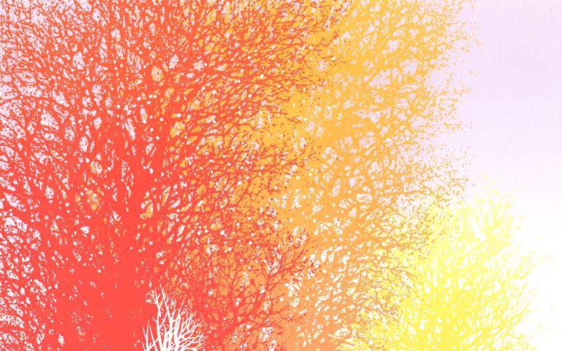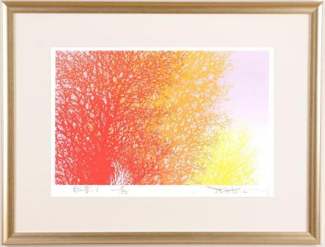 池上壮豊先生がシルクスクリーンの版画で制作した木の絵画「紅景-3」は、夕日を浴びた木が赤や黄色に染まった美しい木の絵です。