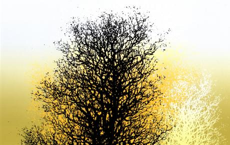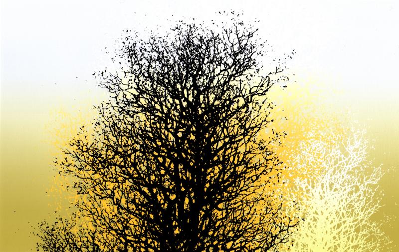 池上壮豊先生がシルクスクリーンの版画で制作した木の絵画「樹光」は、日陰の黒い木と陽を浴びた黄色と白の木の対比がとても面白い木の絵です。