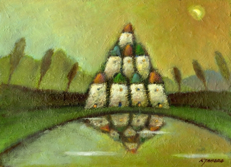 田原健二さんが油絵の絵画で描いた風景画「助け合う家」をぜひご自宅のインテリアやプレゼントの絵としてご購入ください。