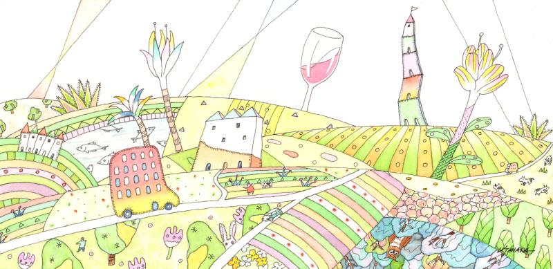 田原健二さんが水彩画の絵画で描いたインテリアの絵「赤いバスが走る村・6」をぜひご自宅のインテリアやプレゼントの絵としてご購入ください。