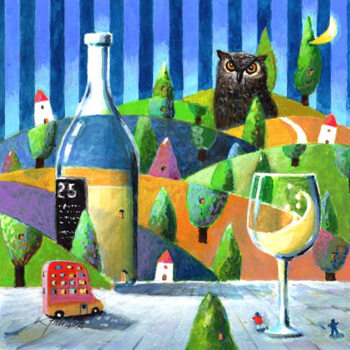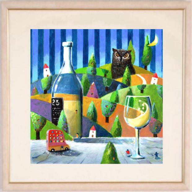 田原健二さんがアクリル画の絵画で描いたインテリアの絵「赤いバスとミミズクの夜」をぜひご自宅のインテリアやプレゼントの絵としてご購入ください。