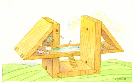 この水彩画の絵画に描かれているような木でできたプールがあったらすぐにでも泳いでみたいです。
