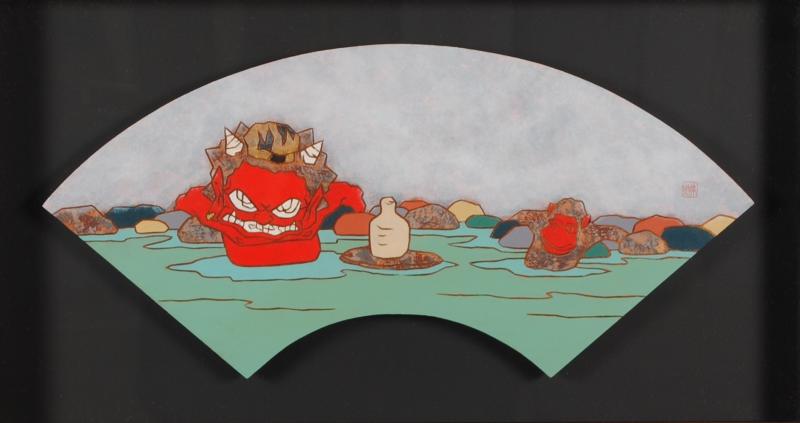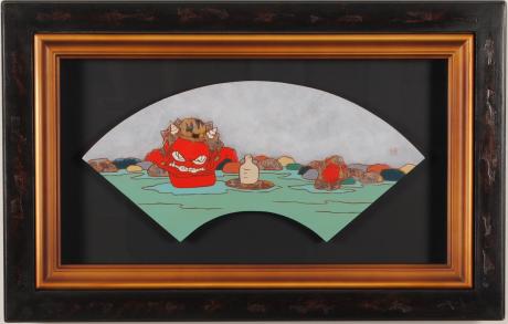瀧下和之さんのアクリル画の絵画を代表する「桃太郎シリーズ」の中の一作で、扇の形をした変形サイズの絵です。