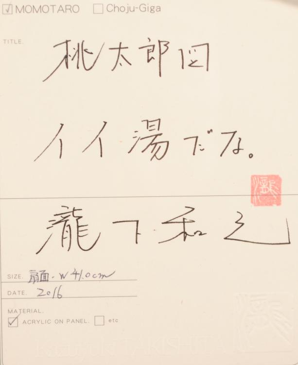 瀧下和之さんがアクリル画の絵画で描いた絵「桃太郎図 イイ湯だな。」は、2016年に描かれたアクリル画の絵画です。