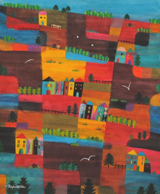 絵の真ん中上部には、羊が2頭いる牧場のような場所が描かれているので、かなり田舎の方の町だと思います。