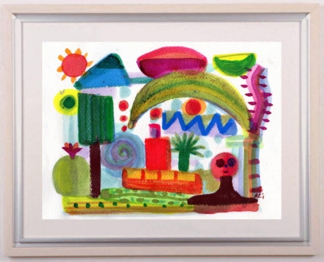 秋永清二さんがミクストメディアの絵画で描いた抽象画「フルーツの島」をぜひご自宅のインテリアやプレゼントの絵としてご購入ください。