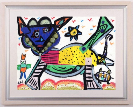 このミクストメディアの絵画は、アクリル絵の具やクレヨン、マジックなどで描かれ、色紙がコラージュ(貼りつける)されています。